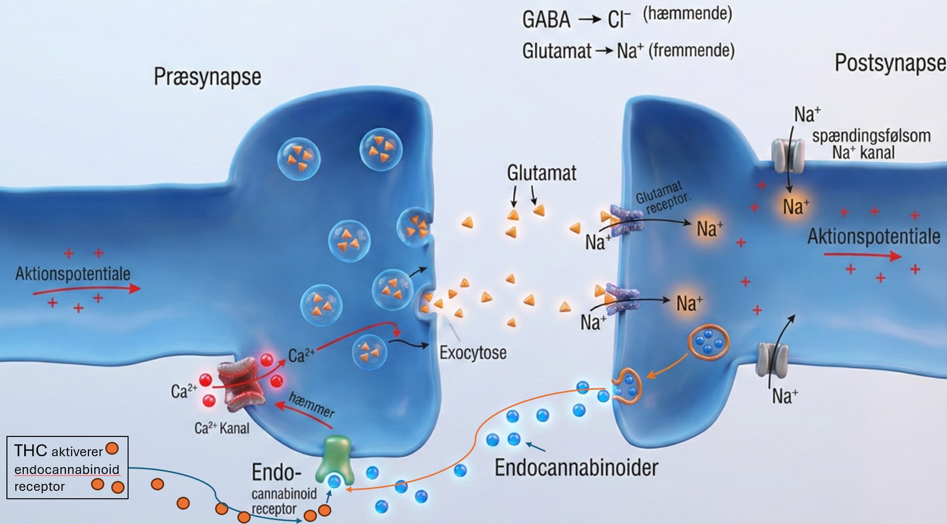 Når I ser på figuren, viser den en hel rækkefølge af processer: Aktionspotentiale ankommer i præsynapsen → Calciumkanal åbner → vesikler til cellemembran → glutamat i synpsespalte → glutamat receptorer aktiveres på postsynapse → Na+ strømmer ind → postsynapse frigiver endocannabinoider → aktivere endocannabinoi receptor → hæmmer Calciumkanal → hæmmer glutamat frigivelse fra præsynapse. THC → aktivere endocannabinoid receptoren (agonist) → hæmmer Calciumkanal (altså samme effekt som vores cellers egen neurotransmitter endocannabinoid)