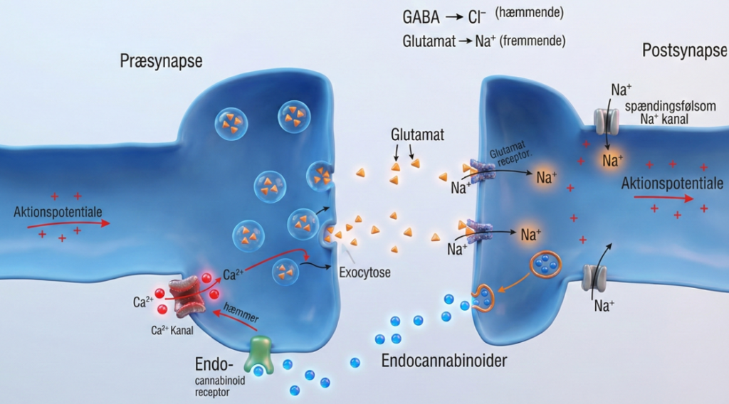 Når man ser en figur, der viser, at THC binder til en endocannabinoid-receptor (CB1-receptoren) og at dette hæmmer calciumkanalerne i den presynaptiske neuron, så virker det umiddelbart enkelt: THC → receptor → hæmning af calciumkanal → ændret neurotransmitterfrigivelse.