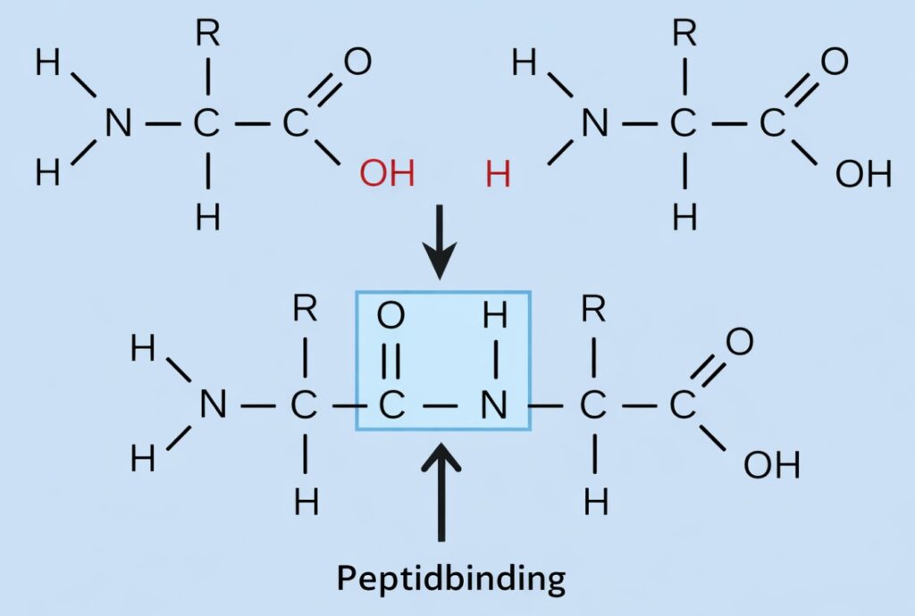 På figuren herunder er vist hvodan en peptidbinding dannes mellem to aminosyrer. Peptidbinding er den binding, der dannes mellem to aminosyrer, når carboxylgruppen fra den ene reagerer med aminogruppen fra den anden, samtidig med at der fraspaltes et vandmolekyle. Denne binding kobler aminosyrer sammen til lange kæder af aminosyrer som man også kalder polypeptider og proteiner